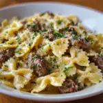 A delicious and creamy pasta dish featuring bowtie pasta, tender beef, and a rich Parmesan garlic sauce.
